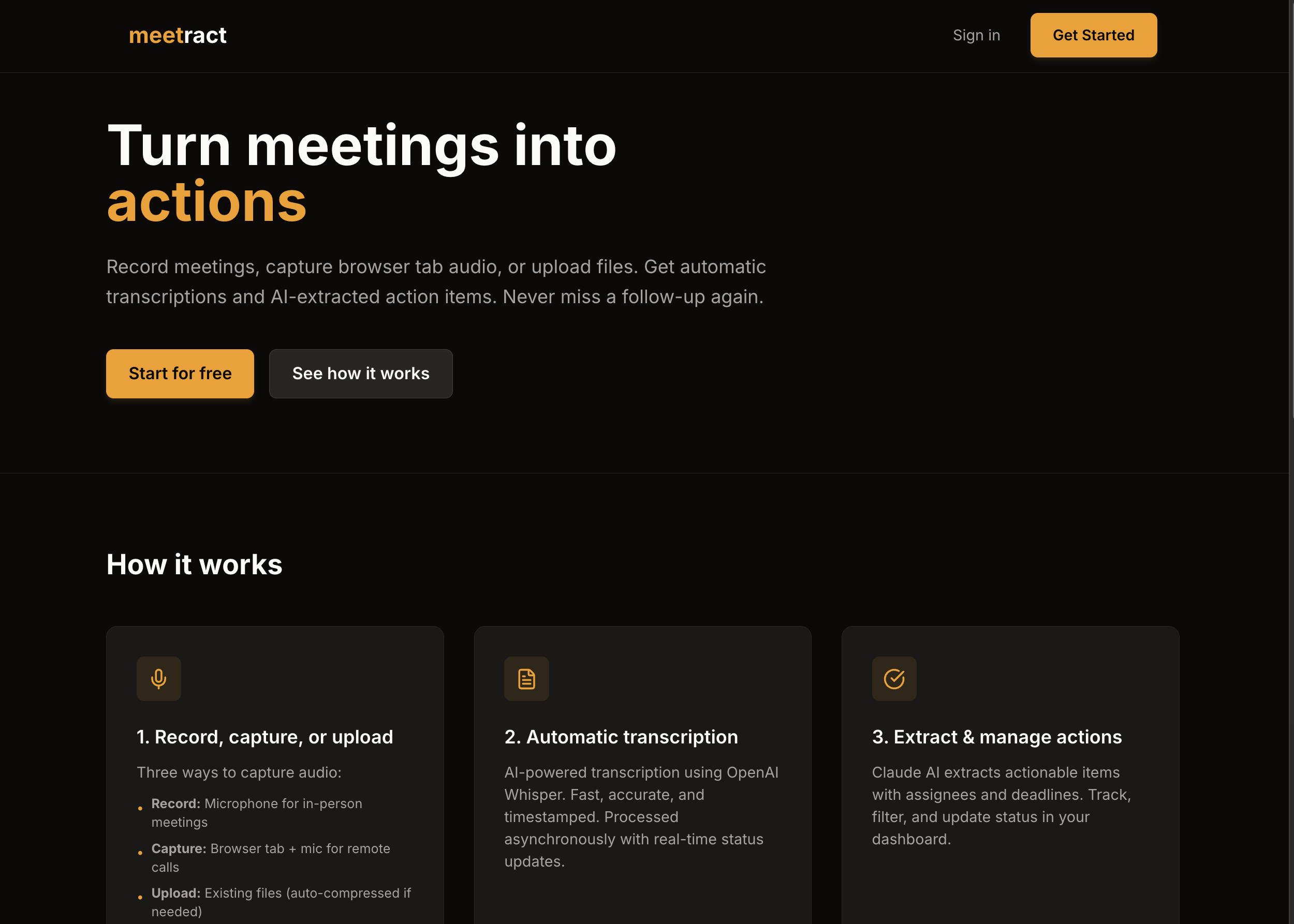 Meetract transforms meeting recordings into actionable tasks. Record meetings directly in your browser (works with Zoom, Google Meet, Teams) or upload audio files. The app transcribes using OpenAI Whisper, then extracts action items with Claude AI. Built with a fully serverless, event-driven architecture on AWS - the API returns instantly while processing happens asynchronously in the background. Includes GDPR-compliant data deletion, Google OAuth, and smart usage limits.